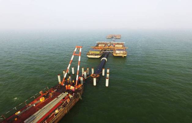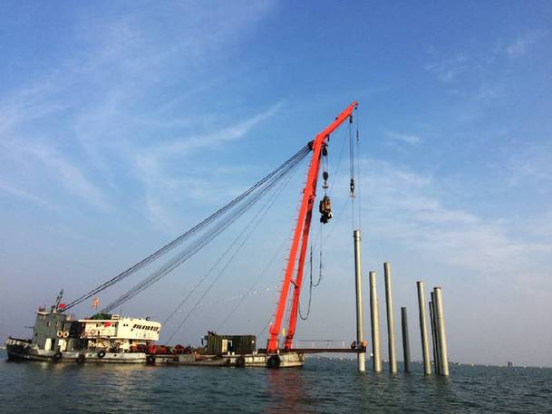 此次建設(shè)者們面對的是直徑2.6米,沉管長度228米,水深超過20米的水下鋼管鋪管施工,因為其超大直徑、超長沉管、超深水域的特點,被業(yè)界稱為國內(nèi)最深水下鋪管工程,施工難度極大。項目開工之后,建設(shè)者們就遇到第一個難題,水下沉管首先需要在平均深度達(dá)到20米的湖底打下93根鋼管樁,以3根為一橫排,豎排31根要保持在一個直線上,以便水下沉管固定安裝。由于水深關(guān)系,以現(xiàn)有彈簧振動樁錘或者液壓式?jīng)_擊錘,難以達(dá)到深水樁基進(jìn)度要求,為此,建設(shè)者們創(chuàng)新研制了新型深水樁基送樁器,其本體由上、下兩部分組成,上部分采用上部鋼管,在所述上部鋼管的外表面由上至下標(biāo)有刻度尺,用于控制貫入度及施打深度;下部分采用下部鋼管,上下兩部分通過上下部分連接件銜接,分別與上下部分鋼管焊接,在與上下部分焊接部位沿著鋼管周側(cè)等間隔設(shè)有若干加勁板。 通過新型深水樁基送樁器使用,保證了深水打樁垂直度、貫入度、樁頂標(biāo)高。
